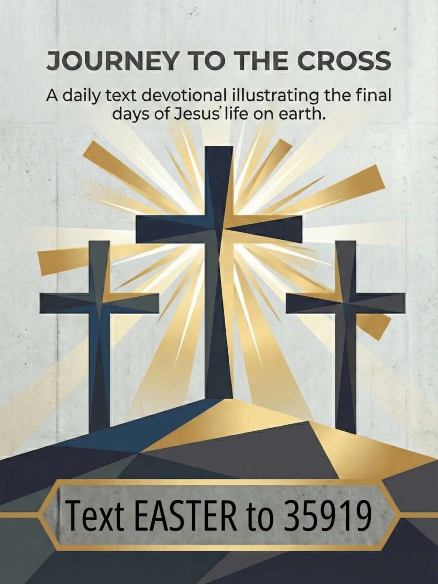 Text EASTER to 35919 to sign up for Journey to the Cross, an eight-day, text-based Easter devotional. From Palm Sunday to Resurrection Day, follow along with Jesus Christ’s journey to Jerusalem, the cross, and beyond!